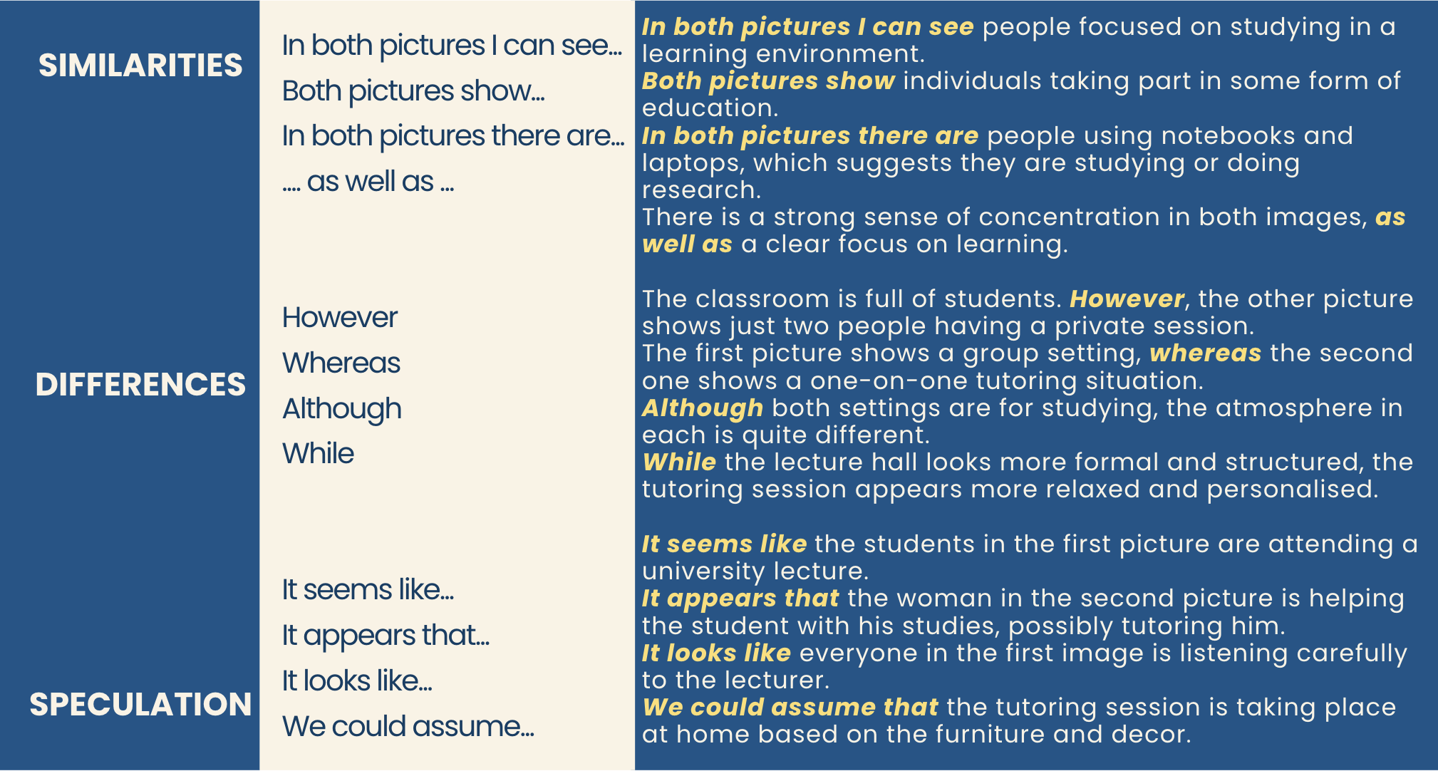 In Speaking Part 2 you should not describe each picture separately. Instead, you need to do 3 things: show similarities, differences and speculate.