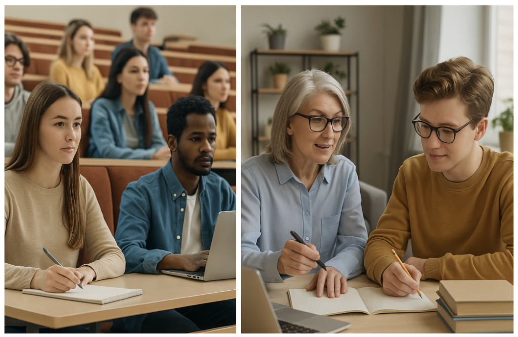 It seems like the first picture is a university lecture. It looks like the students are listening to a teacher. It appears that the second picture is a private lesson at home. We could assume the older woman is helping the young man with his studies.